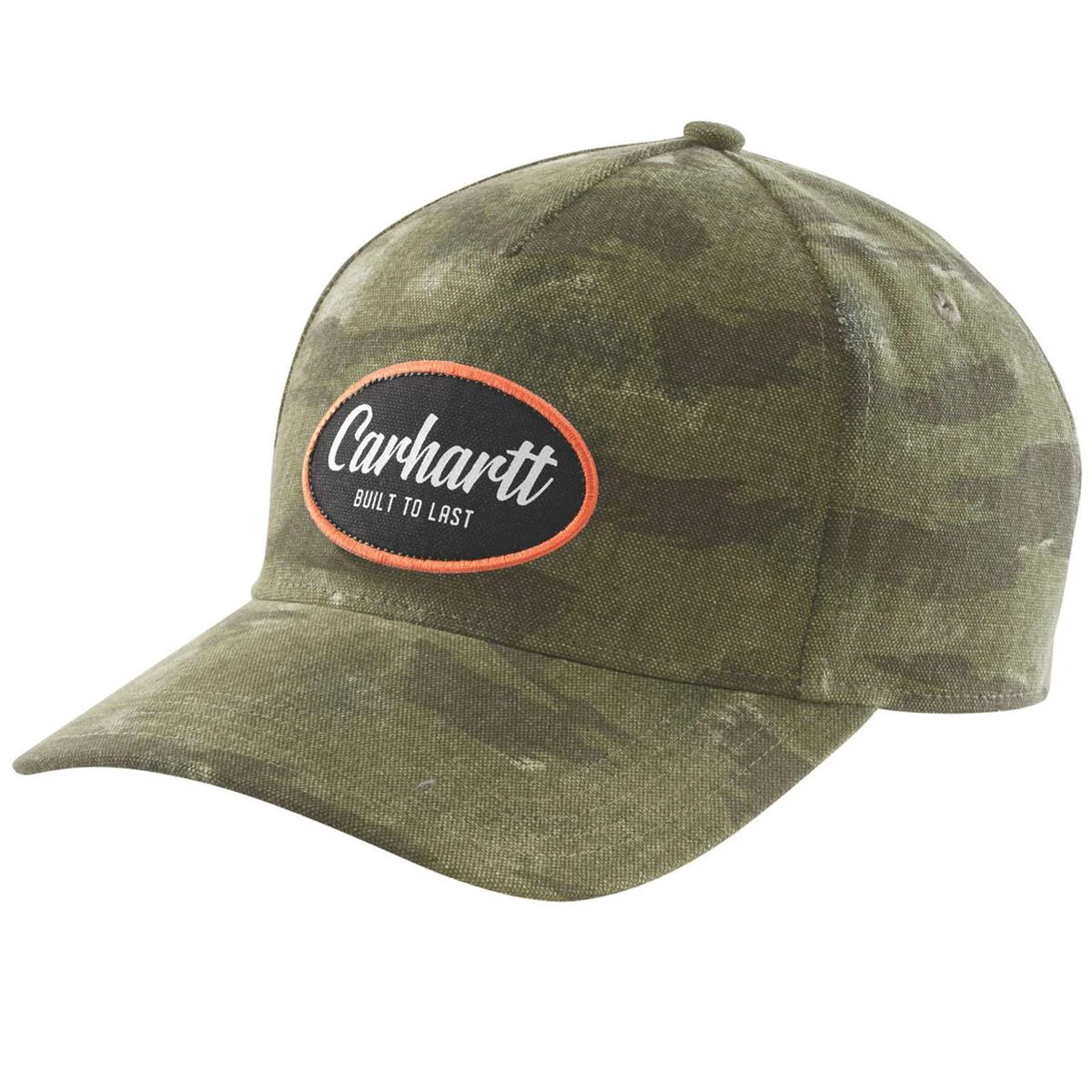 - Carhartt „Built to Last“ Aufnäher auf der Vorderseite und Carhartt-Etikett auf der Rückseite